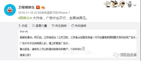2016年11月18日,网络消息爆料,“限韩令”迎来了升级,消息称包括韩剧、韩国电影、韩国明星参演的影视综艺以及根据韩国影视改编的作品均不得播出,但已拿到批文的,引进韩国模式的国内自制综艺不在此限。