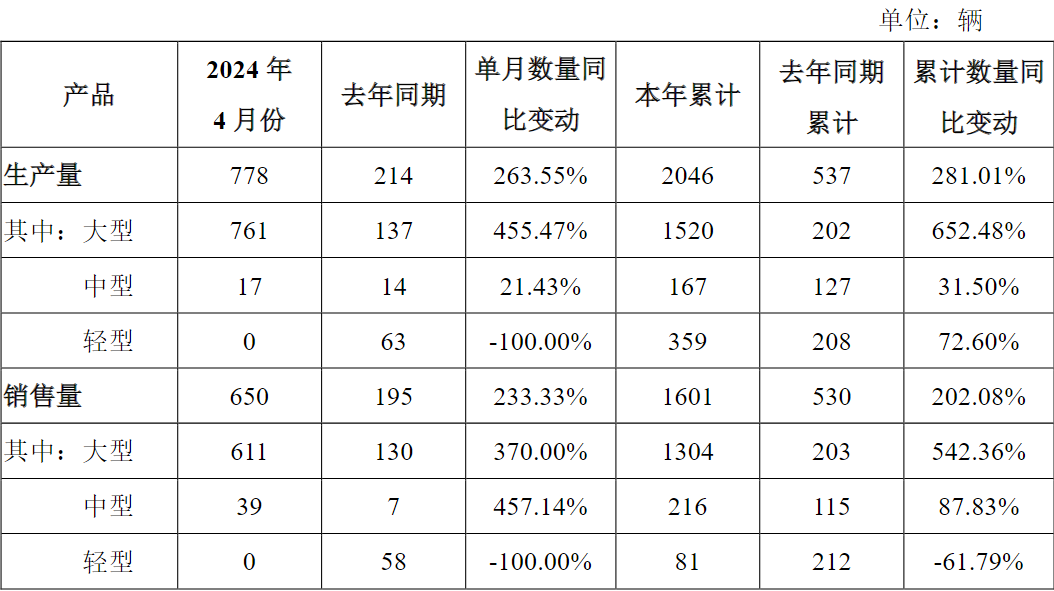 *ST亚星5月7日公告,4月份销量650辆,同比增长233.33%;前4月销量合计1601辆,同比增长202.08%。
