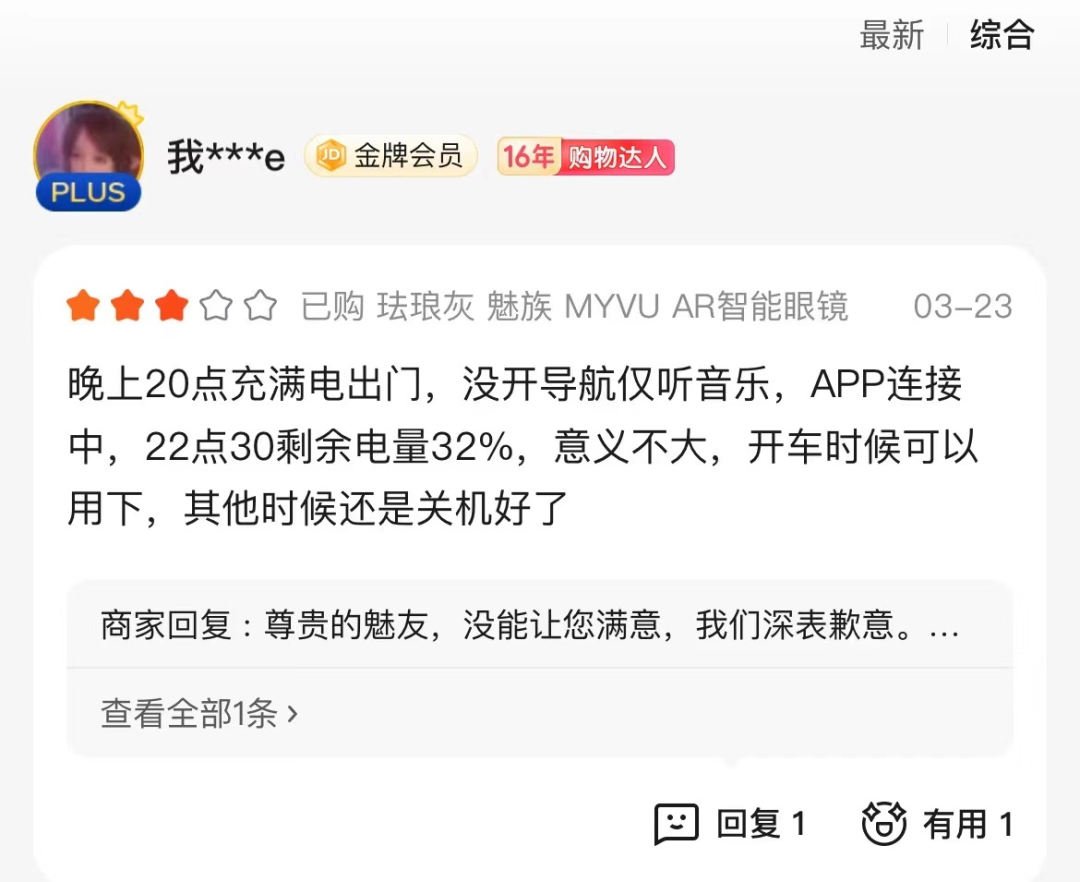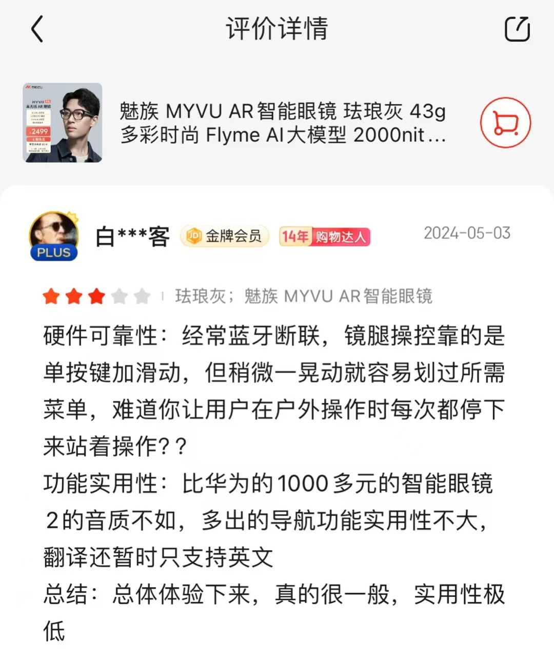 另外,魅族MYVU AR智能眼镜在电商平台的买家评价中褒贬不一。其中一位买家的评价十分中肯“建议有需要的人入手,例如讲师、直播等,针对性使用表现还不错。”这恰巧说明了这款AR眼镜不具备广泛的客户群体,有限的功能决定了只有特定人群买来才有用,销量自然很难保证。