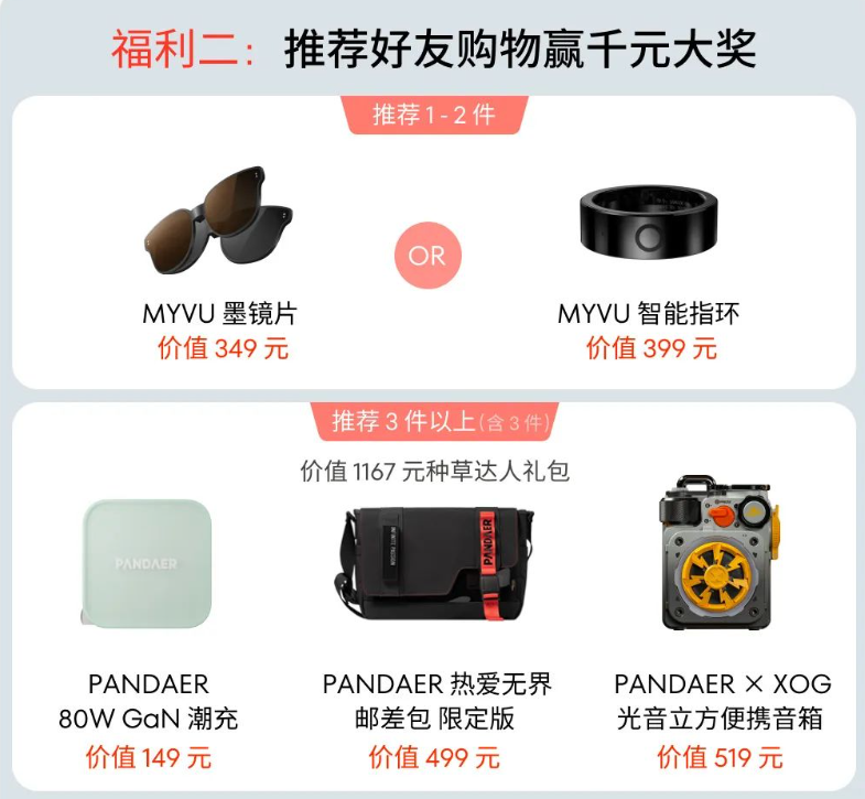 2024年3月5日,魅族全网招募 MYVU AR 智能眼镜种草达人,每日分享 MYVU眼镜和推荐好友购买 MYVU眼镜即可完成任务,其中,推荐一到两位好友购买 MYVU成功后可免费获得 MYVU墨镜片或 MYVU智能指环,如果3位以上的好友通过推荐购买了眼镜,那么推荐者即可获得价值1167元的种草达人礼包。