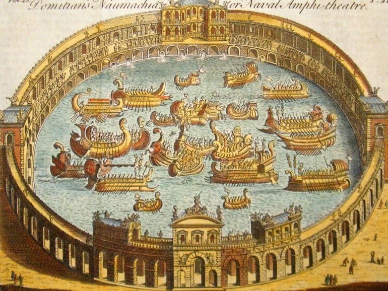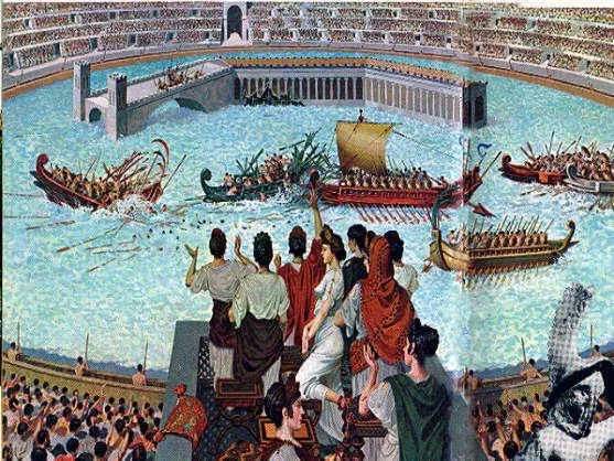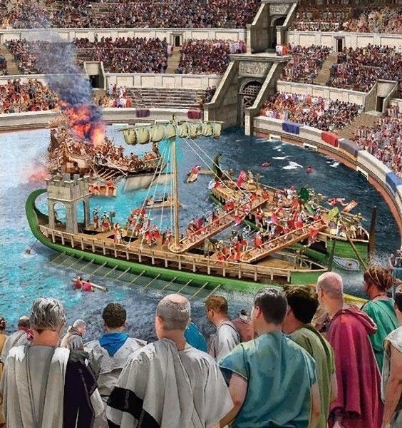 话说,公元前46年,尤里乌斯.凯撒下令在战神广场挖一个巨大的洼地,并在四周围了一圈观众席。这项工程前后花了四年时间,建成了一个规模庞大的角斗场。只是,和其他竞技场不通的是,这个场地四周有进排水通道,场地中央可以装下两米深的水。于是乎,竞技场除了举办陆地角斗之外,还能安排战舰之间的水上对决。