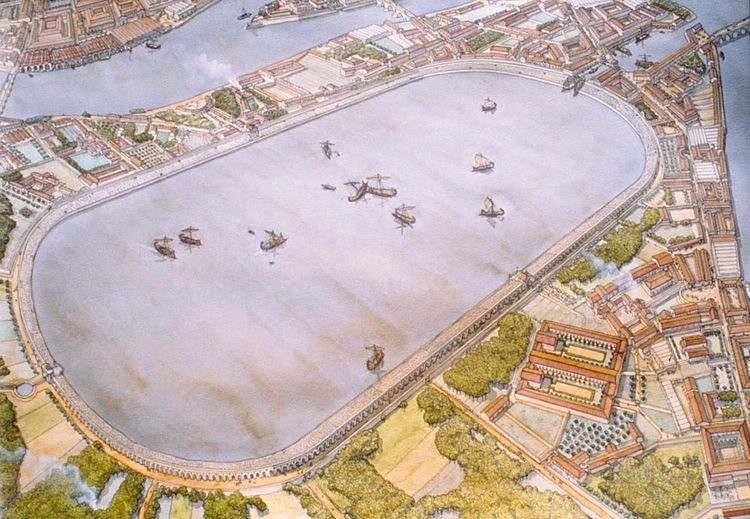 史书记载,在奥古斯都的海战角斗场中央,有一座矩形小岛,由一座桥和水域边缘相连。可模拟对岸攻击的片段。