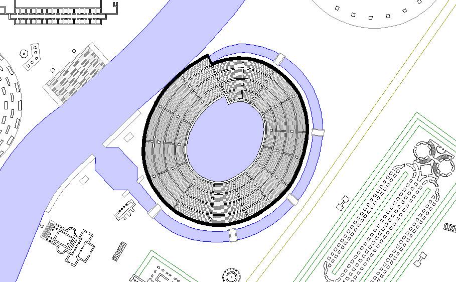 图密善皇帝的海战竞技场的猜想图。背靠台伯河,便于场内的水循环。从比例上来说,这个竞技场比保存至今的斗兽场更大。