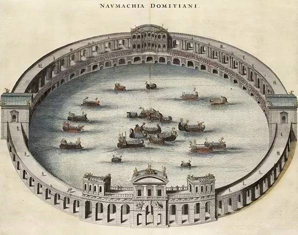 在Suetonius的《罗马十二帝王传》里,经常提到凯撒、奥古斯都、尼禄等皇帝关于安排角斗海战的记载。而奥古斯都在台伯河边建造的533米X355米的温泉剧场,则超过了他的前辈凯撒修建的海战场。史书记载,在奥古斯都的海战角斗场中央,有一座矩形小岛,由一座桥和水域边缘相连。而他们之后的克劳迪亚皇帝,于公园52年在Fucine Lake湖畔,组织了19000名角斗士兵,和超过100条战船,结结实实地模拟里一场灭国级的的海战,目的只是为了庆祝罗马运河工程的启动——这是人类历史上有过记载的,规模最大的一次表演性质的角斗比赛。另外,残暴的尼禄皇帝在位时,也曾修建过一个圆形的模拟海战角斗场,所以,在罗马城周围,可供组织这类“演出”的场地,就超过五个!
