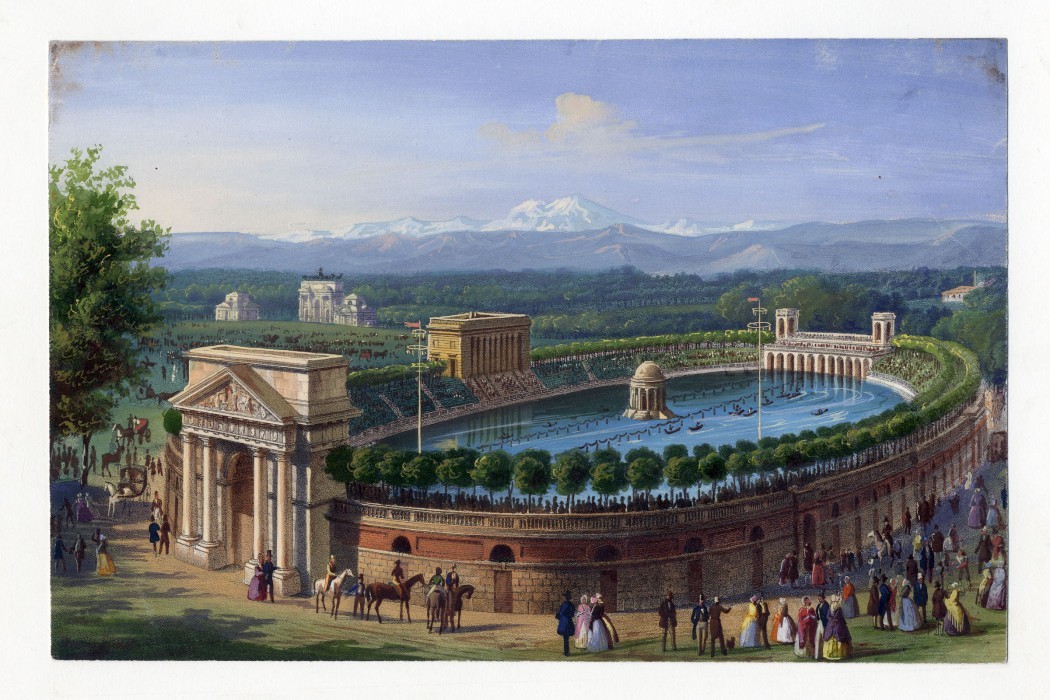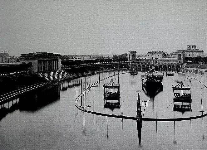 比如位于意大利米兰的Arena Civica足球场,在1807年建成时,就是带有水上表演功能的多功能大型表演剧场,这张不太清楚的照片,就是Arena Civica在改为足球场前的真实身份的证明。上图是它作为水上表演场时的样子。