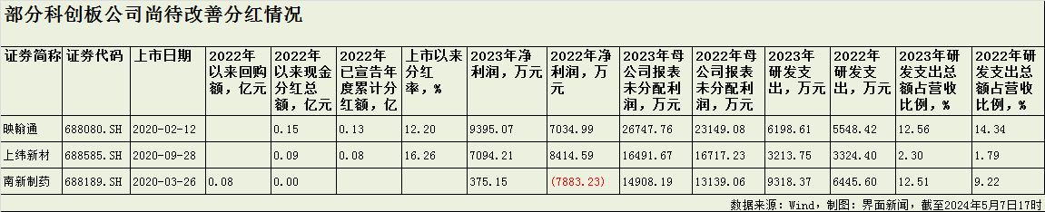 映翰通(688080.SH)、上纬新材(688585.SH)、南新制药(688189.SH)等3家科创板公司尚需在2024年进一步改善其分红情况。