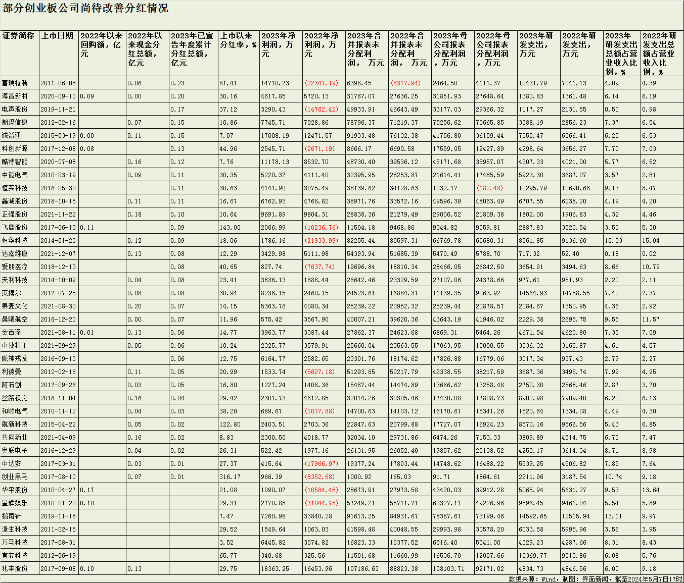 界面新闻根据Wind数据统计显示,38家创业板公司仍需在最后一个考核年度改善其分红情况。其中,指南针(300803.SZ)、派生科技(300176.SZ)、万马科技(300698.SZ)、宜安科技(300328.SZ)等公司2022年以来未进行现金分红或股份回购举措。
