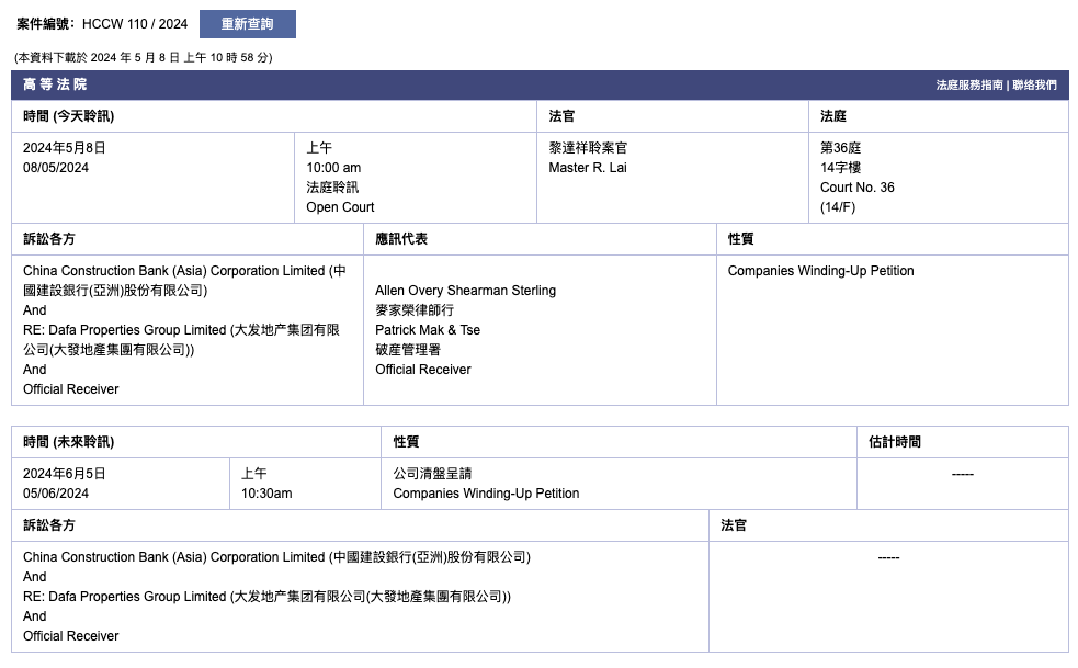 5月8日,据香港司法机构网站,香港高等法院已将大发地产清盘呈请聆讯押后至2024年6月5日。