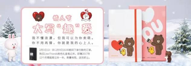 意大利奢侈笔记本品牌Moleskine锁定中国女性消费者。其情人节限量版Line Friends x Moleskine系列的外形走可爱风格。从2月12至2月14日,任何在实体店或天猫旗舰店上消费超520元的顾客可以获得价值388元的情人节礼包。