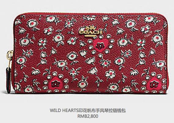 Coach为情人节准备了一系列的带有心形图案的产品。在微信上,顾客也可以订制印有love字样的产品。
