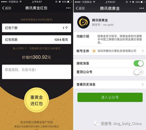 虽然不是奢侈品牌,但是腾讯的微信是众多品牌依赖的平台。微信在情人节上首次推出黄金红包活动。用户在认证他们的真实姓名后就可以购买并获得黄金。用户可以将本人持有的黄金份额以红包的形式转让给亲友。 “黄金红包”是腾讯与工商银行联合推出的在线黄金平台提供的服务。用户最多可购买1.314克黄金,寓意“一生一世”。