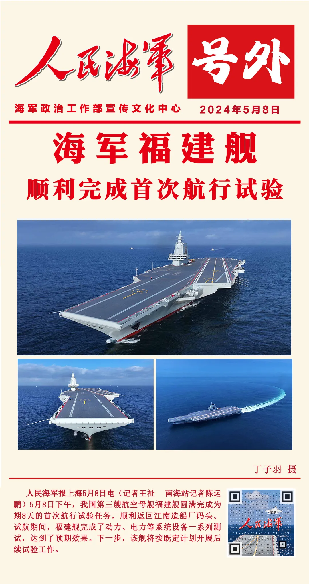 据“人民海军”微信公众号,5月8日下午,我国第三艘航空母舰福建舰圆满完成为期8天的首次航行试验任务,顺利返回江南造船厂码头。试航期间,福建舰完成了动力、电力等系统设备一系列测试,达到了预期效果。下一步,该舰将按既定计划开展后续试验工作。
