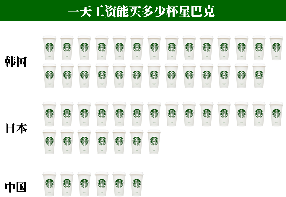 之前国际劳工组织(ILO)做了全球用户一天工资能买多少杯星巴克的调查,结果显示:按照日本的平均工资计算,一天可以喝21杯,在韩国达到了27杯,而在中国只有6杯。