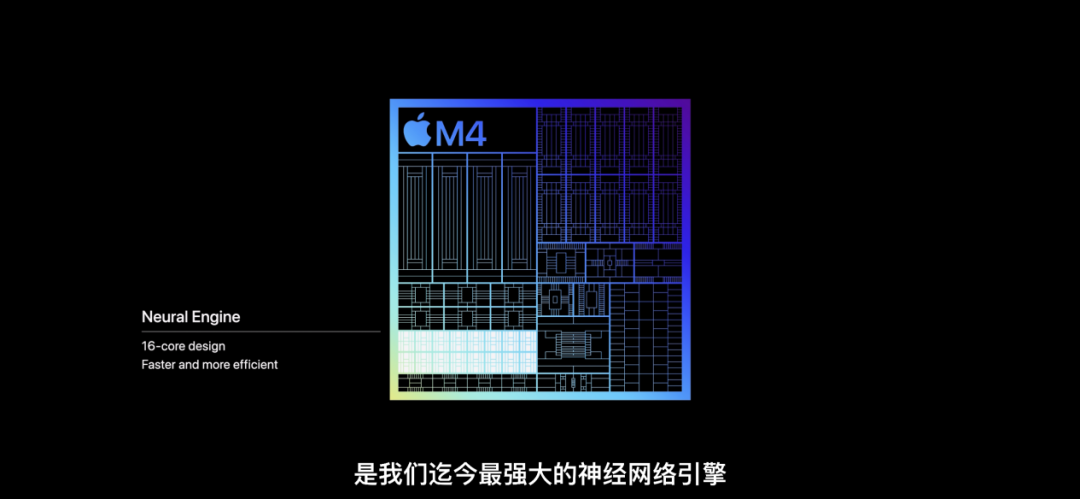 值得一提的是,M4芯片搭载的全新神经引擎,几乎为AI能力量身定做,算力相较上一代M3提升10%~15%。神经网络引擎主要负责机器学习部分,例如面容解锁、图像处理等,而搭载M4芯片的产品将在这些应用上大幅提升执行效率。
