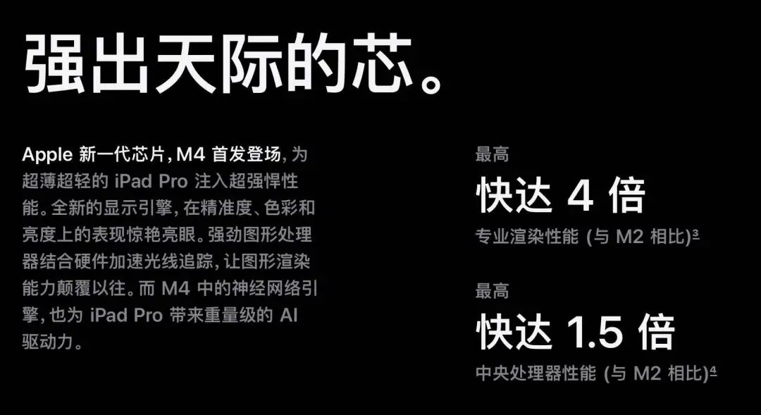 M4提供与M2相同的性能时,功耗仅为M2的一半。苹果方面还表示,新iPad Pro比初代iPad Pro快10倍。