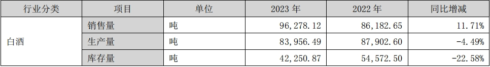 2020年-2023年,泸州老窖成品酒库存量分别为3.59万吨、5.28万吨、5.46万吨、4.22万吨,半成品酒(含基础酒)库存量分别为27.83万吨、38.57万吨、40.26万吨、43万吨。到了2023年,泸州老窖生产量8.4万吨,同比减少4.49%,但销售量达9.63万吨,同比增加11.71%,在产销的配合下,库存量同比减少22.58%。
