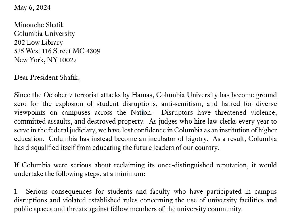 本周一,美国第11巡回上诉法院法官伊丽莎白·布兰奇等13名保守派联邦法官联名向哥伦比亚大学校长米努什·沙菲克和哥大法学院院长致信,宣布今后将拒绝雇用2024年入学的哥大学生,包括本科毕业生和法学院学生。