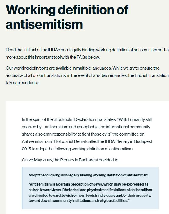 联盟在2016年对反犹主义做出定义,认定反犹主义是对犹太人的某种看法,可能表达为对犹太人的仇恨。为详细解释反犹主义,国际大屠杀纪念联盟列出了一系列案例,包括针对犹太人或犹太人集体力量做出的不真实、非人性化、妖魔化或刻板影响的表态,比如称犹太人控制某国媒体、经济、政府或其他社会机构。