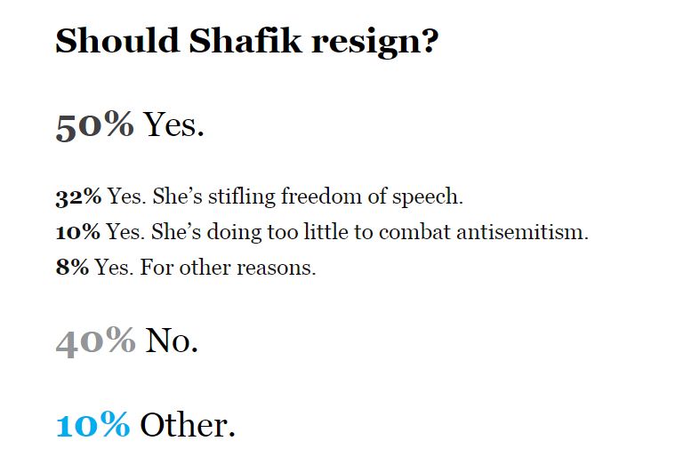 《哥伦比亚每日观察》与《纽约》杂志联合对哥大学生展开的民调显示,高达77%的受访学生强烈反对校方对本轮抗议的处理方式。受访学生中有50%认为校长沙菲克应该下台,其中32%认为她限制了言论自由。