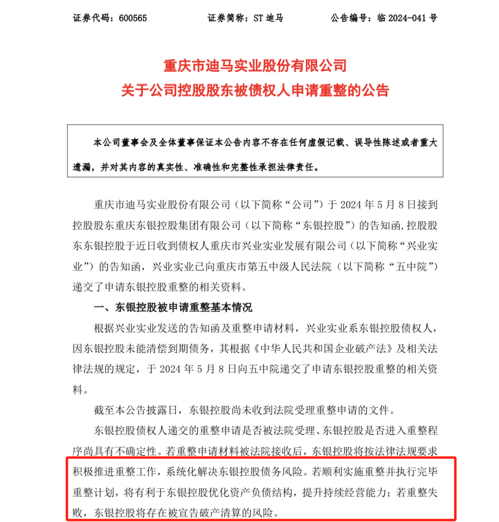 值得注意的是,就在迪马股份被业绩亏损、债券违约等一系列组合拳打的分身乏力之际,其控股大股东重庆东银控股集团有限公司(简称“东银控股”)的重组进展传来利好消息,东银控股将引入国资战投,这也意味着东银控股历经五年多的重组有了实质性进展。