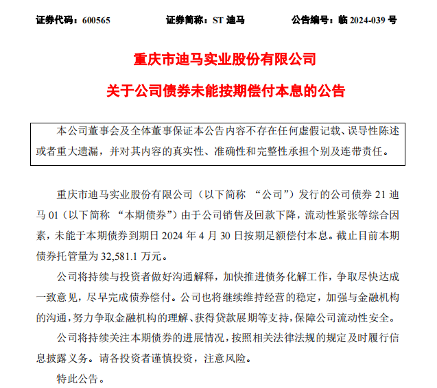 5月6日晚,重庆迪马实业股份有限公司((简称“迪马股份”)发布了一条债券未能按期偿付本息的公告。