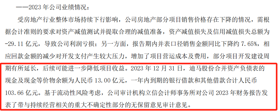 谈到亏损的原因,迪马股份称受房地产行业整体市场持续下行影响,公司房地产部分项目销售价格下降,计提了资产信用减值损失总额为-29.11 亿元,