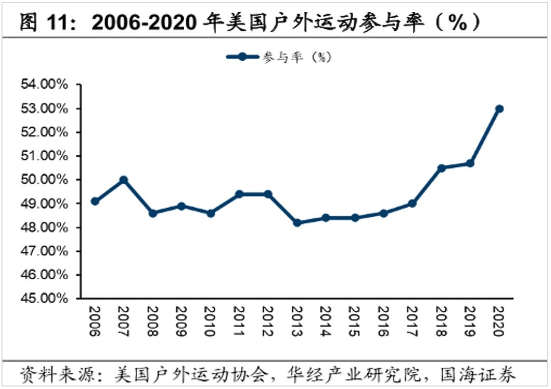 如下图,2020年美国的户外运动参与率,已经突破50%(国内仅有9.5%)。截至2023年,约9000万人年参加户外活动51次或以上。