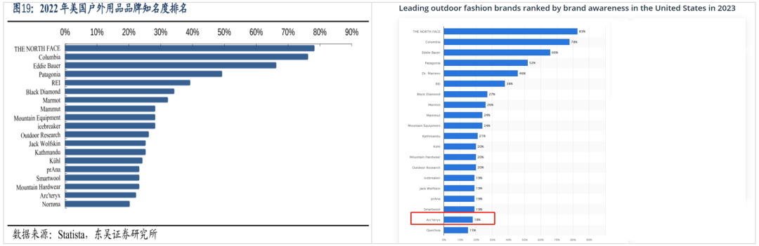 这让海外核心高频的专业户外用户逐渐远离。如下图,2022-2023年,始祖鸟在美国户外品牌知名度排行榜上本就不高的名次,再次下滑。