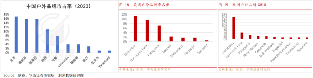 而海外则不然,遍地都是户外牌子。如下图,欧洲户外品牌CR10只有34%;美国的情况也类似。