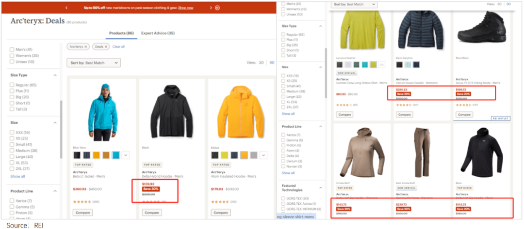 比如,Altitude Sports官网上展示的品牌超过400多个;而北美最大的运动装备零售商REI,更是手握1037个户外品牌,常年提供折扣,供用户比价、挑选。