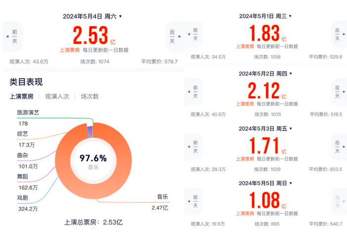 从票房数据来看,据灯塔专业版演出板块最新统计,今年五一假期五天单日上演票房全部破亿,5月4日更是创下2.53亿的单日破纪录票房,这2.53亿里音乐类目票房占了97.6%(2.47亿),足见头部歌手演唱会强劲的票房拉动力。