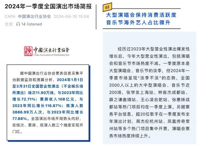 上个月,中国演出行业协会官微公布了一组数据,称“今年一季度全国营业性演出(不含娱乐场所演出)场次达11.90万场,同比增长72.71%;票房收入108亿元,同比增长116.87%;观演人数3886.99万人次,同比增长77.88%”。从这组官方数据来看,Q1演出市场整体市场表现是比我们“体感”更好的。尽管目前五一市场各项数据还未出炉,整体上似乎还是延续了向好趋势。