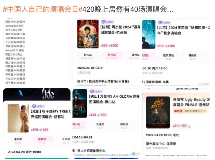 不知各位是否关注到,前段时间五一前的「4月20日」一度被网友称为是 #中国人自己的演唱会日#,原因是当晚全国各城市上演了包括周杰伦、蔡依林、薛之谦、王心凌、李荣浩等头部华语歌手在内的多达40+场演唱会,周末市场卷出新高度。