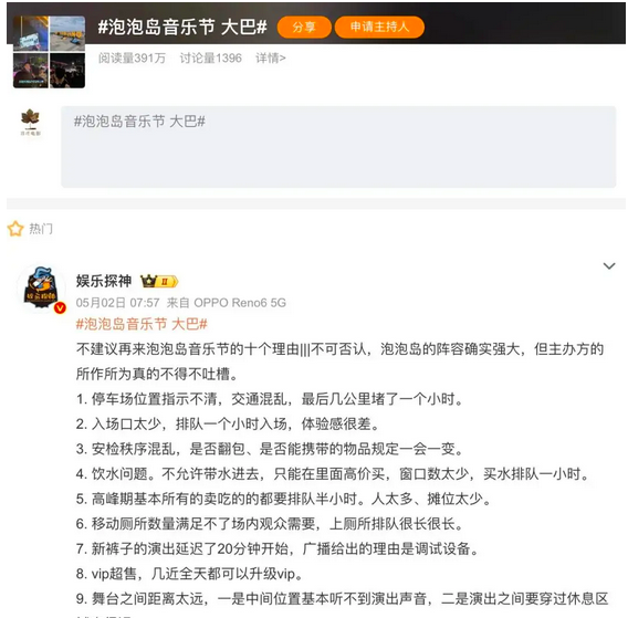 比如,当晚乐迷大巴车超售,演出结束后两个小时仍有大量乐迷没上车,顶热了热搜话题 #泡泡岛音乐节 大巴#;还有乐迷列出不建议再来泡泡岛音乐节的十个理由,诸如停车场位置指示不清、安检秩序混乱、配套饮食摊位供不应求、新裤子演出延迟了20分钟等。连天津的音乐节都有这么多管理不善的服务问题,更低线城市音乐节相关情况就更多了。