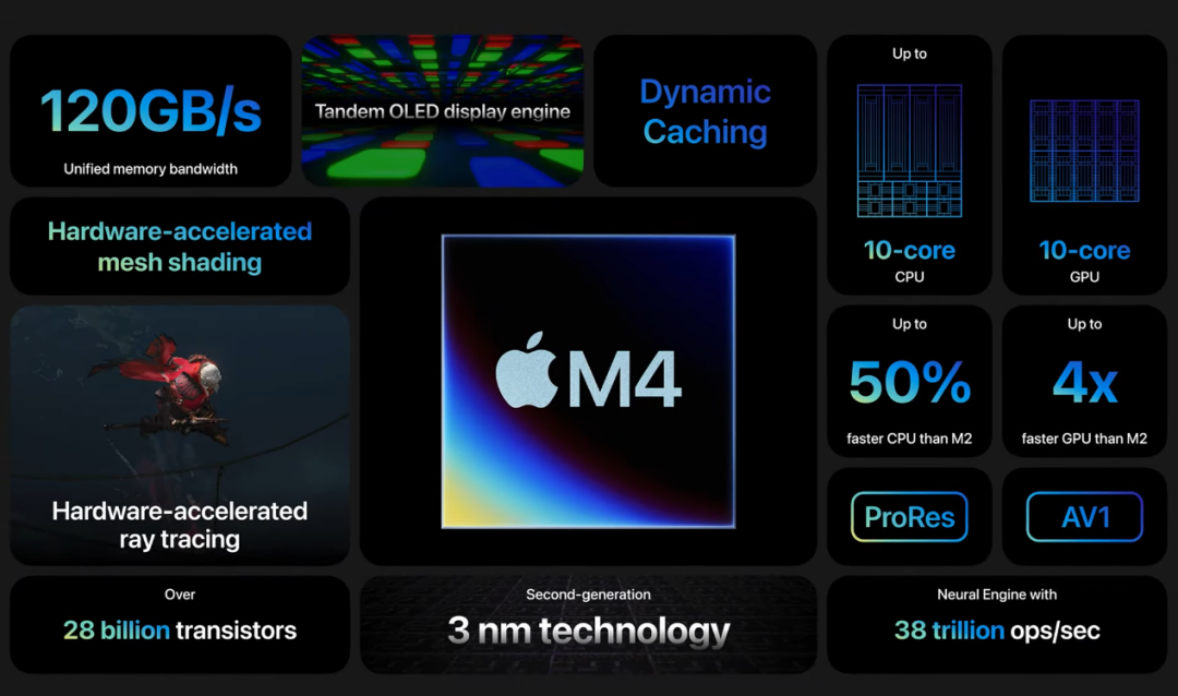对比M3,M4的CPU部分拥有4个性能核心和6个能效核心,据苹果官方测算,其CPU运行效率是M2的两倍;10核GPU首次加入光线追踪、网格着色两大硬件加速功能,并采用第二代台积电3nm技术,使得M4能耗表现显著提升。相同性能下,M4的功耗仅是M2的50%。