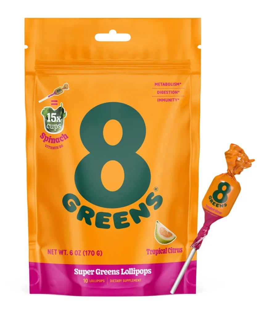 美国品牌8GREENS于2022年推出了一款棒棒糖:每日蔬菜棒棒糖。产品加入了8种绿色蔬菜原料,包含菠菜、羽衣甘蓝、小麦草、芦荟、大麦草、蓝绿藻、螺旋藻和小球藻,为热带柑橘风味。