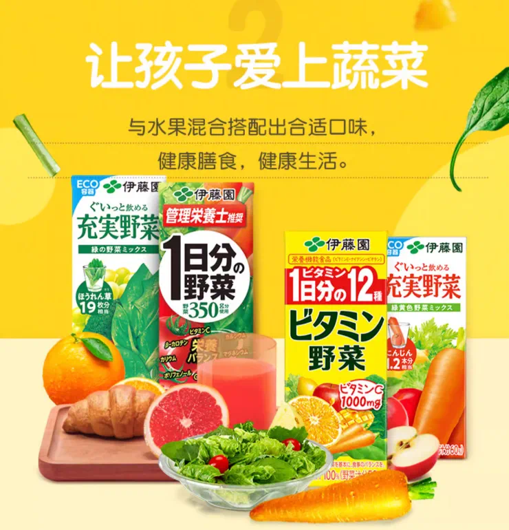 伊藤园的天猫商品页面,点明了蔬菜汁对挑食孩子的“特攻”。在其果蔬汁产品中,我们能看到“1日分”的标识。“1日分”是日本食品饮料常见的一个概念,指一日的分量,“1日分”食品主打补充每日所需营养[5]。比如,伊藤园就有多款果蔬汁主打“1日分”,指的就是一盒200ml的果蔬汁使用了日本厚生劳动省推荐的每日蔬菜摄入量350克[6]。