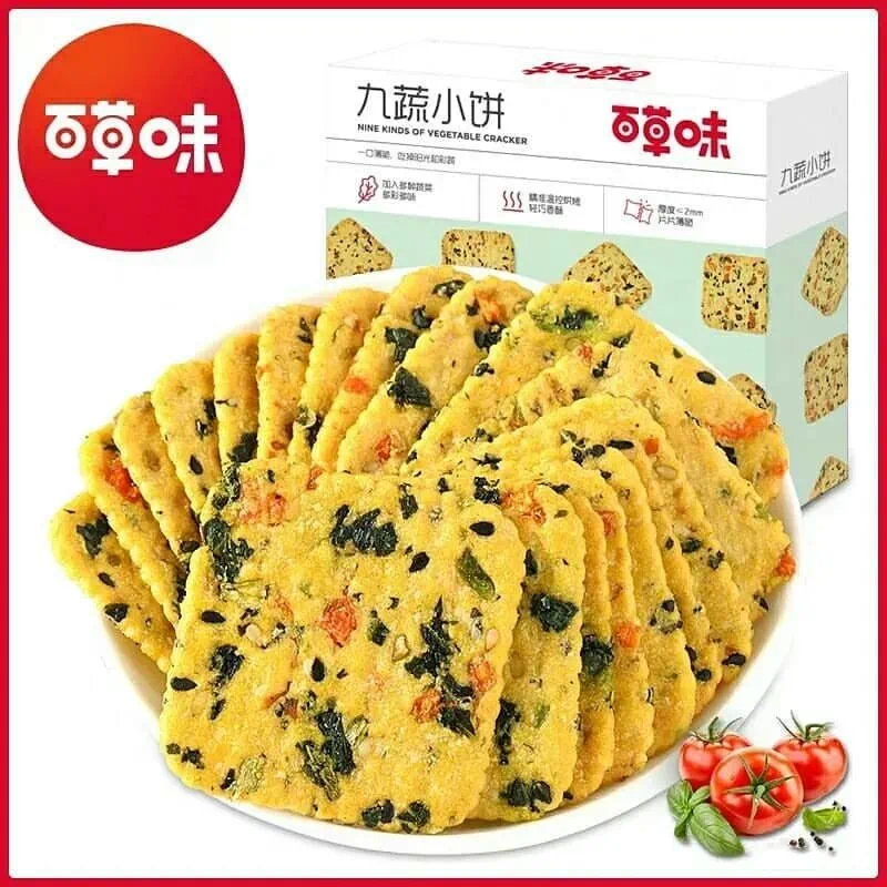 蔬菜饼干也是个常见的品类。例如百草味推出的九蔬小饼,将青梗菜、芹菜、西蓝花、西红柿等九种蔬菜融入到面团中,利用四温区烤炉烘烤,制成2毫米的轻脆小饼干。2020年,这款产品在天猫旗舰店中月销量达到10万+。
