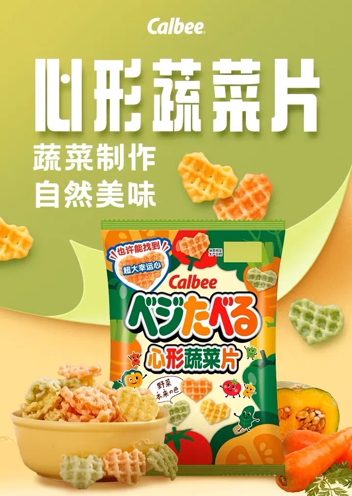 日本品牌类似的产品,则突出了适合儿童的属性。卡乐比这款蔬菜片含有青椒、菠菜、胡萝卜、南瓜、西红柿等多种蔬菜,可以从颜色分辨不同蔬菜。