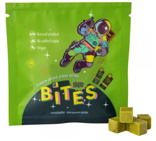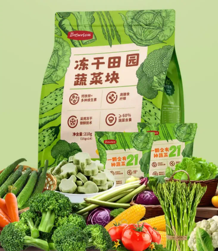 不过冻干蔬菜也不一定要保持蔬菜本来的形状,比如这款冻干蔬菜方块,把豌豆做成了“豌豆黄”。