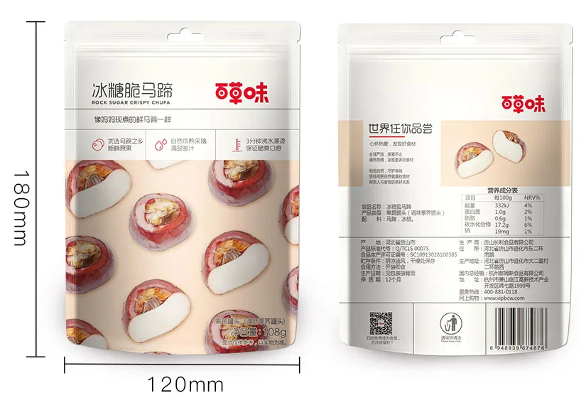 除了咸味辣味零食,甜味蔬菜也可以有自己的高颜值零食,比如有多个品牌在售的零食马蹄(荸荠)。百草味冰糖脆马蹄在京东获得了超过10万条消费评价,有不少消费者喜欢该款产品。