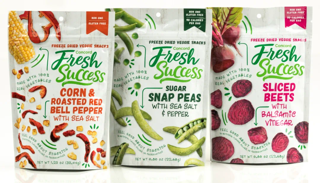 蔬菜干可以不只是蔬菜干,加些调味或许能带来更多选择。Concord Foods就曾推出过以冻干蔬菜为主体的零食,如咸辣玉米干、海盐胡椒甜豌豆、香醋甜菜片等。