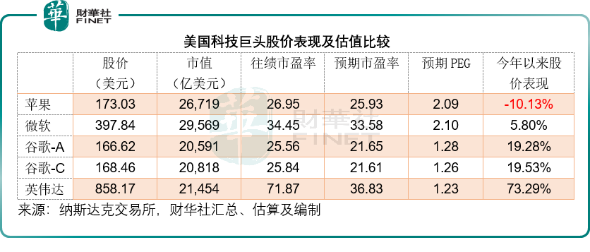 今年以来,苹果的股价累跌10.13%,明显落后于其他科技巨头,例如微软、谷歌(GOOG.US)、英伟达(NVDA.US)等,其市值与英伟达的差距也在缩小,见下表。