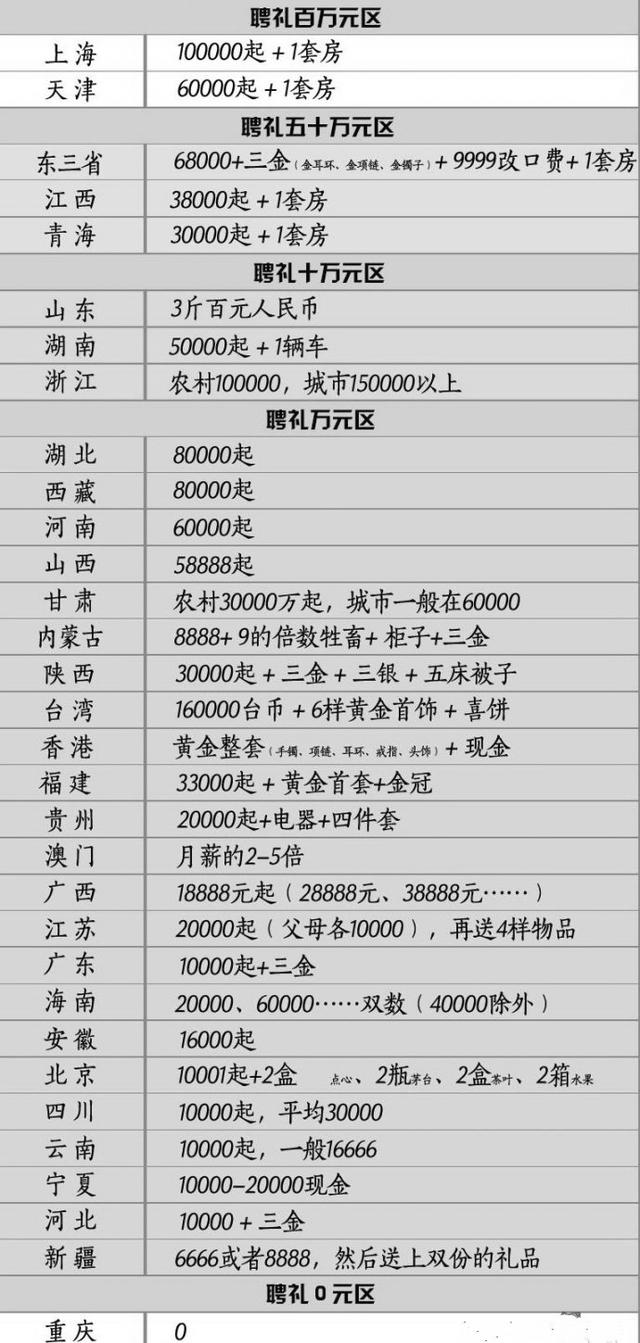 我们中国年青人订婚,20多年前一般是“三金”:金戒指、金手镯、金项链,10年前好像有种说法是“万里挑一”,就是10001元钱,现在又有了“一动不动”,汽车和房子。
