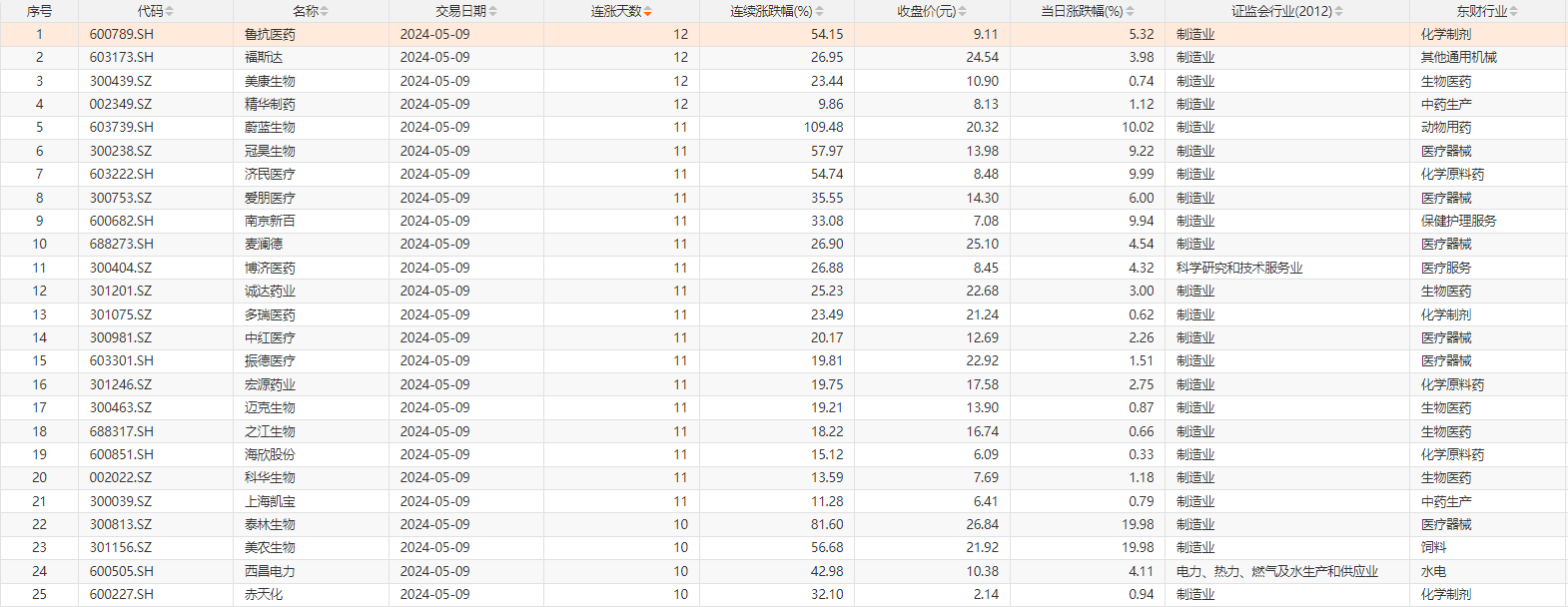 5月9日,Choice数据统计,今日4只个股连续12天上涨,包括鲁抗医药、美康生物等;17只个股连续11天上涨,包括冠昊生物、蔚蓝生物、爱朋医疗等;此外,泰林生物、西昌电力、睿智医药等15只个股连续10天上涨。