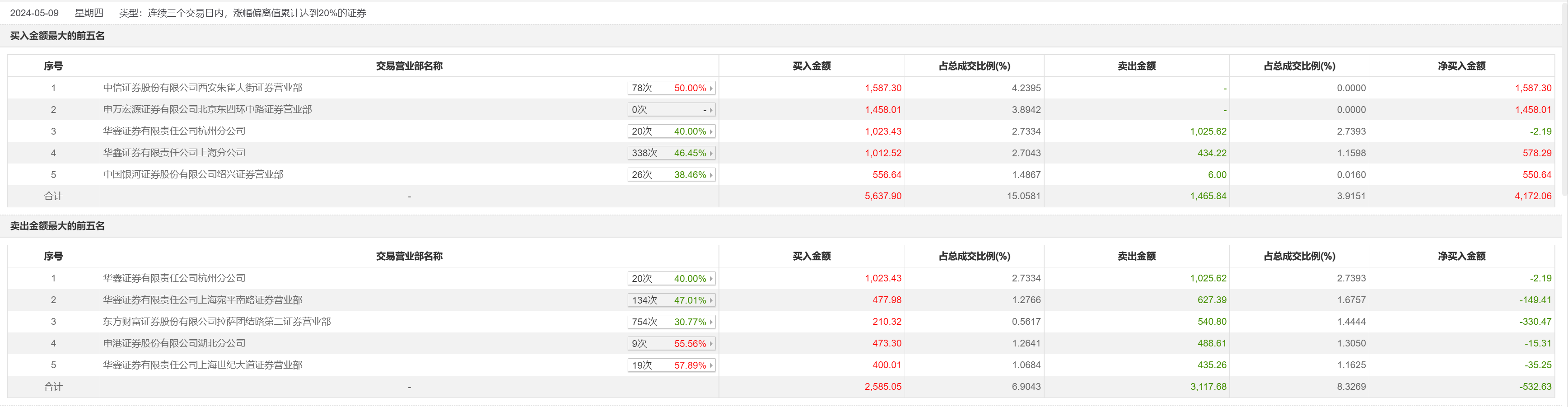 具体来看,方新侠(中信证券西安朱雀大街证券营业部)、申万宏源证券有限公司北京东四环中路证券营业部分别买入1587.30万元、1458.01万元;华鑫证券杭州分公司、炒股养家(华鑫证券上海宛平南路证券营业部)分别卖出1025.62万元、627.39万元。