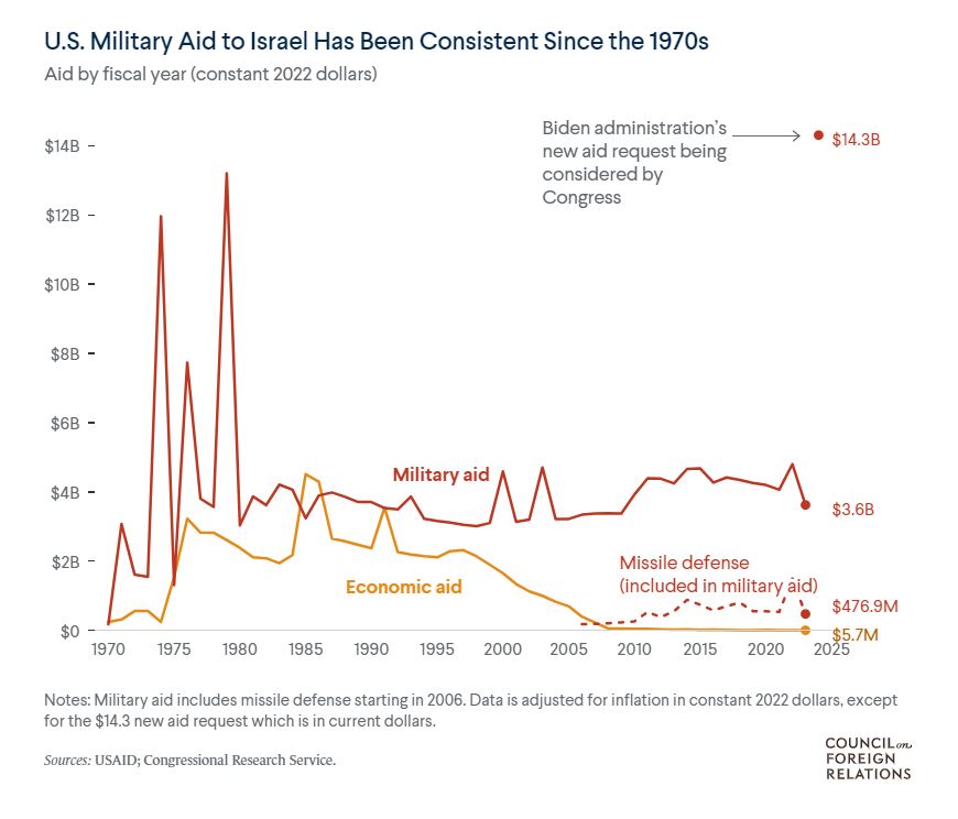 美国外交关系协会统计显示,自以色列建国后到2023财年,以色列从美国累计接收了3000亿美元的经济和军事援助。