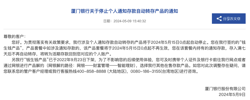 5月9日,厦门银行股份有限公司发布通知,为贯彻落实有关政策要求,该行涉及个人通知存款自动转存的产品将于2024年5月15日0点起自动停止。客户在该行签约的“钱生钱产品”,产品套餐中如涉及通知存款的,该产品套餐将于2024年5月15日0点起不再生效,客户在该套餐内持有的通知存款,存入满七天后不再自动转存,将转为活期存款回到客户对应的个人账户。