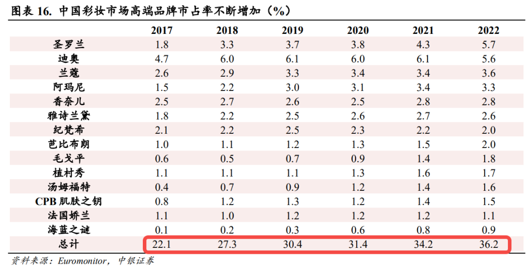 从品牌端来看,2017年至2022年,高端彩妆品牌在中国市场的份额占比连年上升,由22.1%上升至36.2%。