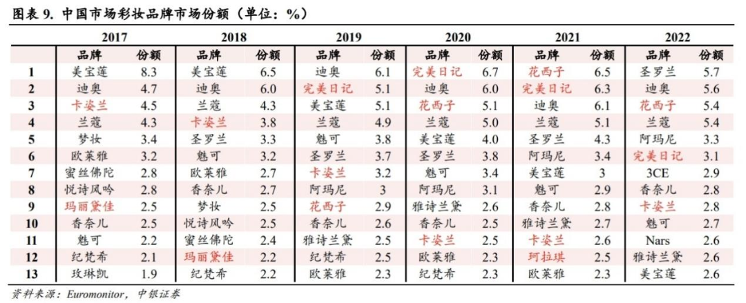 根据欧睿数据,早在2017年,卡姿兰以4.5%的市场份额,居国货彩妆品牌市占率第一、全品牌第三。